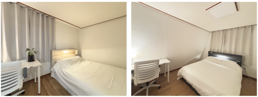 두 개의 방에는 각각 퀸 사이즈 침대와 책상이 준비되어 있어 휴식과 집중의 균형을 자연스럽게 이어갑니다.
